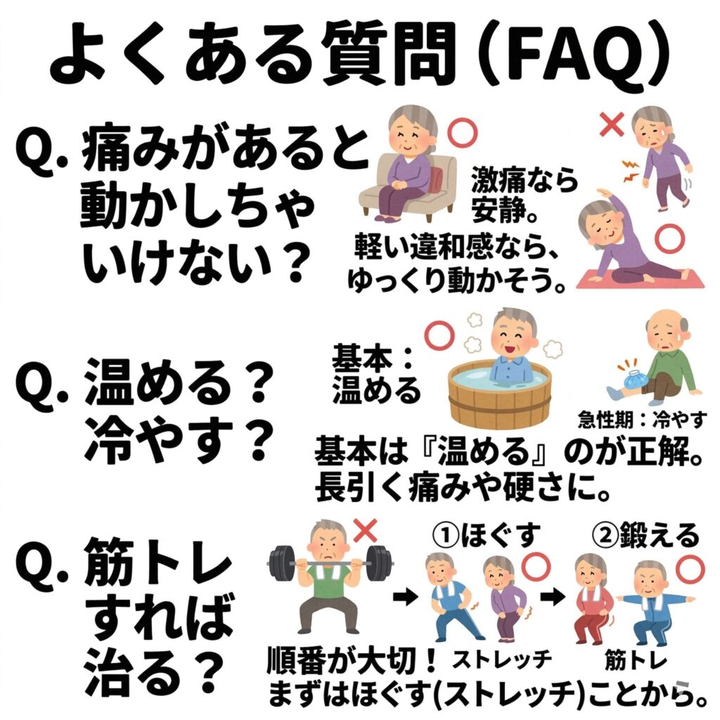 筋力は必要ですが、ただ鍛えれば良いというわけではありません。 股関節を支える筋肉(特にお尻の筋肉など)を鍛えることは非常に大切ですが、硬くなった筋肉をそのままにして筋トレを行うと、さらに詰まり感が強くなってしまうことがあります。まずは「ほぐす(ストレッチ)」、その次に「鍛える(筋トレ)」という順番が大切です。自己流の激しい筋トレは症状を悪化させることもあるため、最初は専門家の指導を受けることをお勧めします。