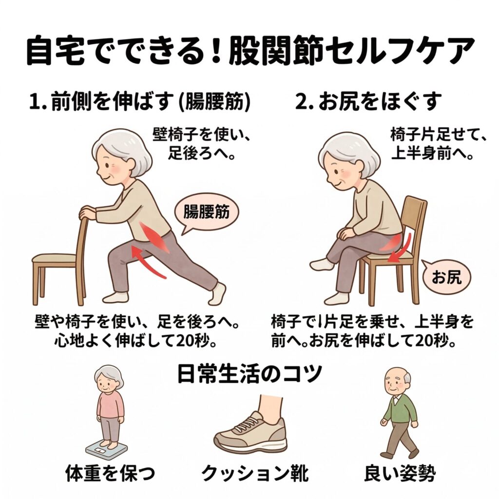股関節の詰まりを解消し、階段をスムーズに動かすためには、関節周りの筋肉を柔らかくし、正しく使えるようにすることが大切です。ここでは、私が診察室でもお伝えしている、簡単で効果的なセルフケアを2つ紹介します。