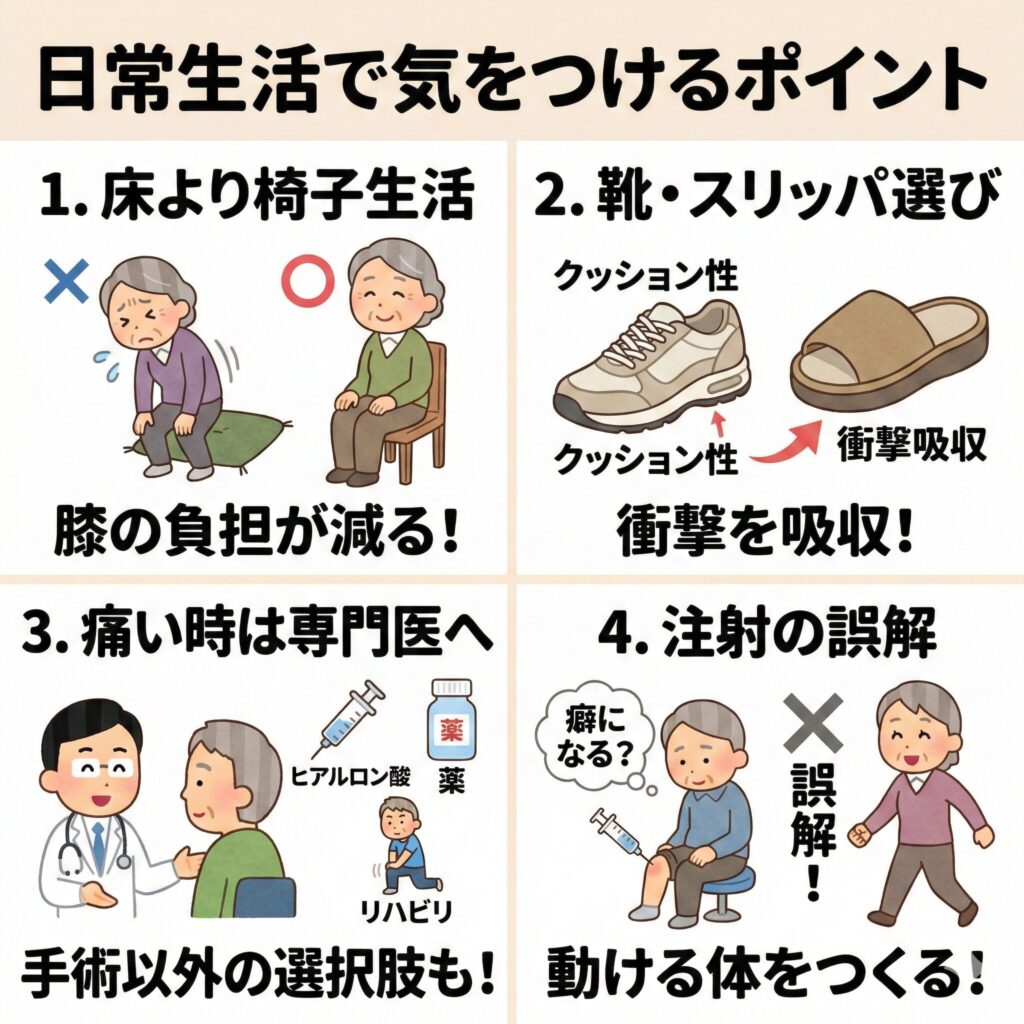 運動と合わせて、生活習慣を少し工夫するだけで膝への負担はさらに減ります。