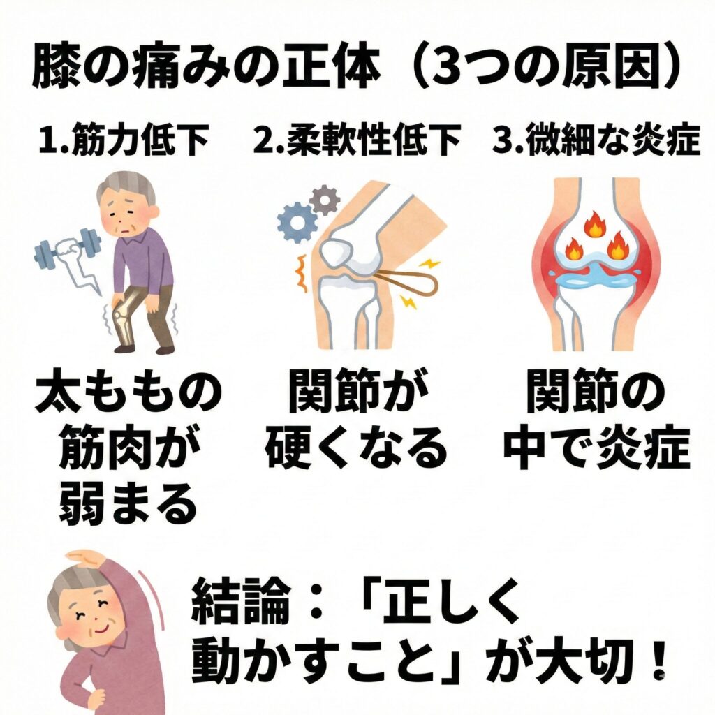 膝の痛みを引き起こす大きな要因は、主に3つあります。