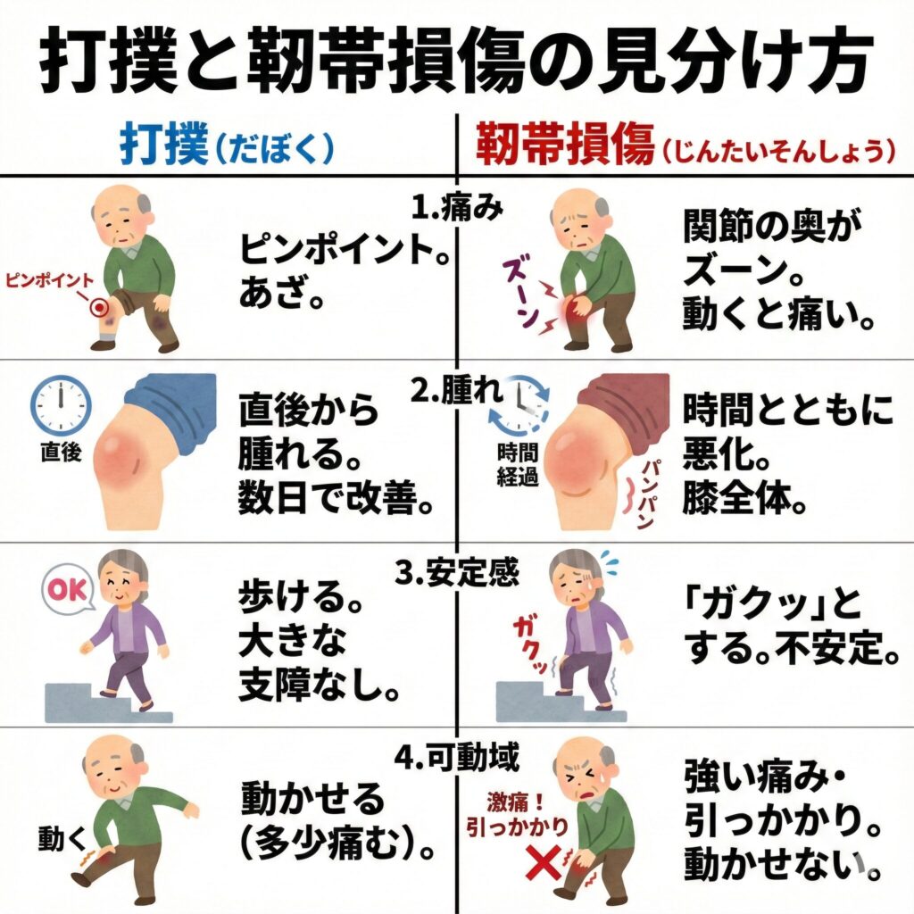 以下のポイントを参考に、単なる打撲か、靭帯損傷の可能性があるのかを見極めてください。