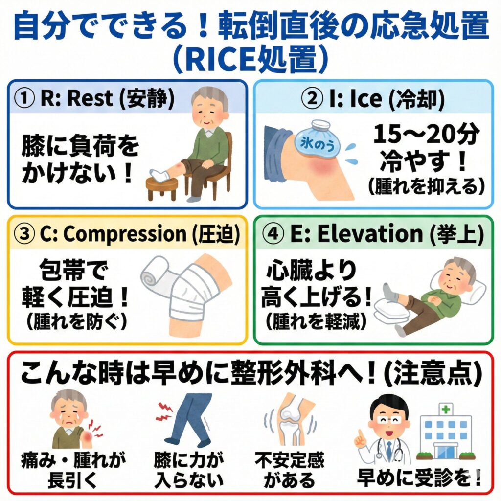 - Rest(安静):膝に負荷をかけないようにしましょう。