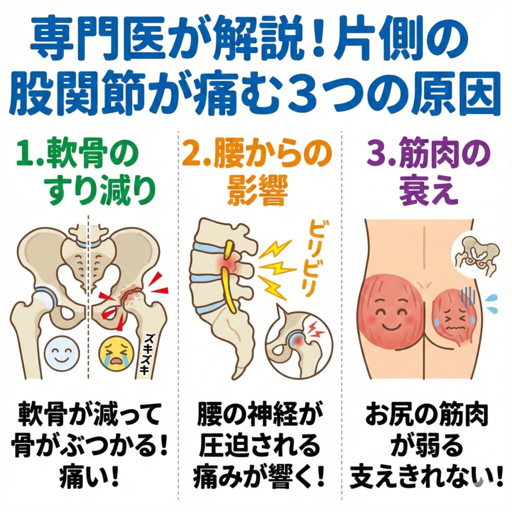 なぜ、片側だけに痛みが出るのでしょうか。もちろん、転んだりぶつけたりといった怪我が原因の場合もありますが、中高年の方に多い原因として、主に3つの可能性が考えられます。