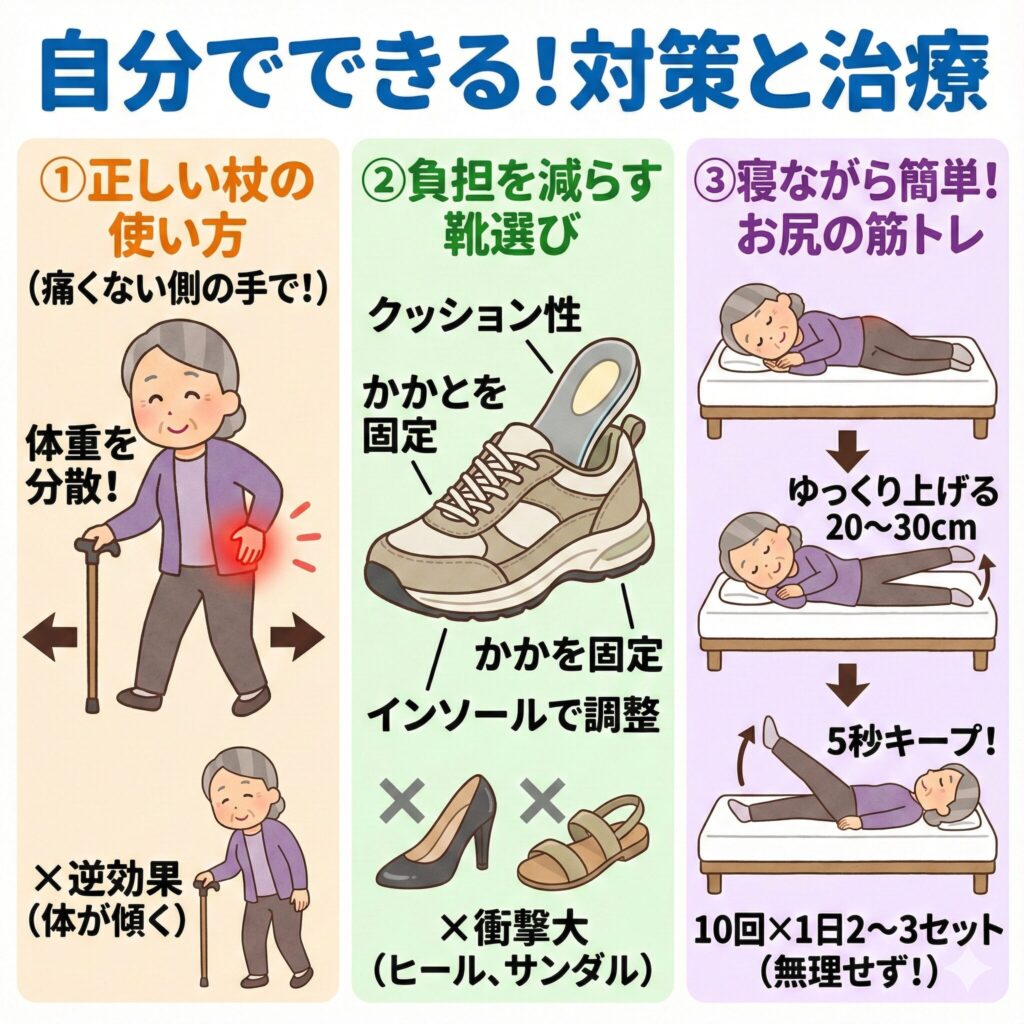 「まだ杖なんて早い」と思われるかもしれませんが、杖は「第3の足」として股関節にかかる負担を劇的に減らしてくれます。 ここで非常に重要なのが、杖を持つ手です。 右の股関節が痛い場合、杖は「左手(痛くない側)」で持つのが正解です。 痛い足と反対の手に杖を持ち、痛い足が出るのと同時に杖をつくことで、体重を分散させることができます。同じ側の手で持ってしまうと、かえって体が傾き、逆効果になることがあるので注意してください。