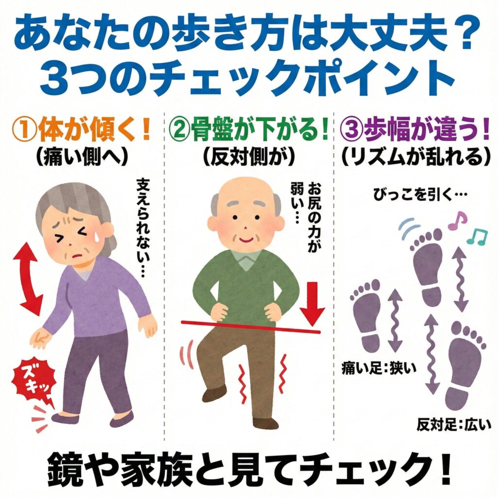 ここからは、鏡の前やご家族に見てもらいながら確認できる「歩き方のチェックポイント」をご紹介します。これらは私たち医師が診察室で必ずチェックしているポイントでもあります。