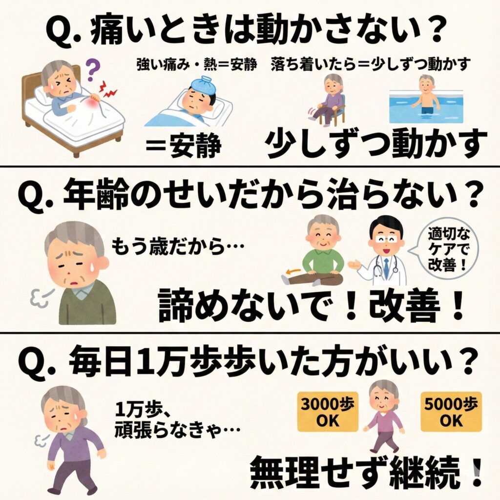 「もう歳だから仕方ない」と諦めてしまう方がいらっしゃいますが、それは大きな誤解です。 確かに関節の経年変化はありますが、適切なセルフケア、筋力トレーニング、そして医療機関での治療を組み合わせることで、痛みを大幅に軽減し、以前のように歩けるようになる方はたくさんいらっしゃいます。年齢は一つの要因に過ぎず、対策次第で膝の健康は守ることができます。